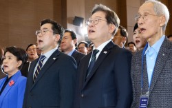 더불어민주당 윤여준 상임 총괄선대위원장(앞줄 오른쪽부터), 이재명 대선 후보, 박찬대, 강금실 선대위원장이 30일 오후 서울 여의도 국회 의원회관에서 열린 제21대 대통령선거 중앙선거대책위원회 출범식에 참석해 애국가를 부르고 있다. 뉴스1 이재명 더불어민…