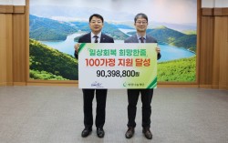 (좌)금정구청 윤일현 청장과 (우)세정 이주형 대표이사가 ‘일상회복 희망한줌’ 100가정 지원 달성을 기념하며 촬영하고 있다. 세정에서 운영하는 사회복지법인 세정나눔재단(이사장 박순호)은 금정구청과 금정구 내 위기가정을 돕기 위한 ‘일상회복 희망한줌’ 업…