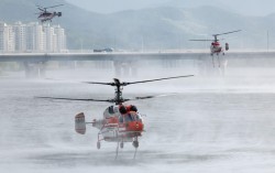 지난달 29일 진화된 대구 북구 함지산 산불이 재발화한 가운데 1일 오전 산림청, 소방 소속 헬기들이 진화작업을 위해 인근 금호강에서 물을 채우고 있다. 연합뉴스 23시간만에 진화됐다가 잔불 정리 중 재발화해 확산했던 대구 북구 함지산 산불이 1일 다시 …