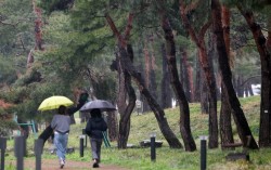 봄비가 내린 22일 오후 경기 수원시 장안구 노송지대에서 시민들이 우산을 쓰고 지나가고 있다. 뉴스1 고온건조한 날씨가 이어지면서 산불 위험이 최고조에 이른 가운데, 다음 달 1일 전국에 봄비가 내릴 전망이다. 어린이날 연휴에도 전국 곳곳에 비 소식이 예…