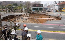 지난달 25일 서울 강동구 대명초등학교 인근 사거리에서 싱크홀(땅 꺼짐) 사고 발생으로 교통이 통제되고 있다. 전날 오후 6시 29분쯤 명일동의 한 사거리에서 지름 20m, 깊이 20m가량의 대형 싱크홀이 발생했다. 뉴스1 서울 영등포구에 거주하는 직장인 손모(2…