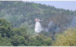 대구 북구 함지산 산불 이틀째인 29일 오후 산불 진화 작전에 투입된 산림청 산불 진화용 헬기가 함지산 상공에서 물을 뿌리고 있다. 뉴스1 대구와 강원 인제에서 최근 발생한 산불이 잇달아 재발화해 산림 당국이 진화 작업에 나섰다. 산림 당국은 30일…