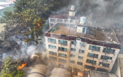 28일 오후 2시 1분쯤 대구 북구 노곡동 함지산에서 발생한 산불이 인근인 조야동 민가까지 확산하고 있다. 연합뉴스 “바람 부는 소리가 들릴 때마다 집이 불에 탈까 근심했어요.” 29일 대구 북구 팔달동의 산불 임시 대피소에서 만난 김재정(71·조야동)씨는 “밤…