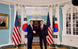 조현 외교부 장관(왼쪽)이 3일(현지시간) 미국 워싱턴 DC 국무부 청사에서 마코 루비오 미 국무장관과 만나 악수하고 있다. 워싱턴=공동취재단 조현 외교부 장관은 3일(현지시간) 마코 루비오 미국 국무부 장관과 만나 한ㆍ미 정상회담 후속 합의 이행과 한ㆍ…