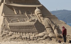 28일 부산 해운대구 해운대 해수욕장에서 조각가들이 모래로 작품을 제작해 바다를 찾은 관광객과 시민들의 눈길을 끌고 있다. 해운대구는 내달 16~19일 ‘2025년 해운대 모래축제’를 개최한다.