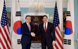 조현 외교부 장관이 3일(현지시간) 미국 워싱턴DC 국무부 청사에서 마코 루비오 미 국무장관과 만나 한미 외교장관 회담을 갖기에 앞서 악수하고 있다. 뉴스1 미국을 방문 중인 조현 외교부 장관과 마코 루비오 미 국무장관이 3일(현지시간) 회담에서 "북한의 완전한…