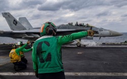 지난달 28일(현지시간) 미국 해군의 항공모함 에이브러햄 링컨호 갑판에서 F/A-18 슈퍼호넷 전투기가 이륙 준비를 하고 있다. AFP=연합뉴스 미국이 최근 중동에 배치한 항공모함에 3일(현지시간) 이란 무인기(드론)가 접근하자 이를 격추했다. 미국과 이…