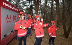 보은산불대응센터 손동진 상황실장(왼쪽 첫번째)과 황종하 반장(왼쪽 두번째)이 대원들에게 진화 현장 대응을 위한 모의 훈련을 하고 있다. 김성태 객원기자 산지 68% 보은군, 692일째 산불 0건 지난 11일 오전 충북 보은군 보은읍 어암리 산불대응센터. 보…