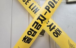 지난 21일 오후 모녀가 숨진 채 발견된 경기 수원 권선구 아파트 현관에 경찰 출입금지 폴리스라인이 쳐져 있다. 현관 밖엔 모녀가 사용하던 것으로 추정되는 바퀴달린 장바구니와 금융결제원에서 발송한 우체국 등기, 파손된 현관 문고리 등이 놓여있었다. 손성배 기자 경…