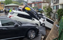 경기 남양주시의 한 아파트 지상 주차장 옹벽이 22일 무너지면서 자동차들이 파손돼 있다. 연합뉴스 22일 오후 1시 10분쯤 경기 남양주시 화도읍의 한 아파트 지상 주차장 옹벽이 무너졌다. 이 사고로 주차된 차량 6대가 무너진 벽 아래로 빠지면서 파손됐다. …