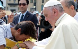 지난 2014년 8월 16일 124위 시복미사에 앞서 펼쳐진 카 퍼레이드에서 프란치스코 교황이 세월호 유가족 김영오씨의 손을 잡고 위로하고 있다. [사진공동취재단] “세월호 참사로 단식하면서 힘들었을 때 가장 큰 위로와 힘이 되신 분인데….” 세월호 참사 유…
