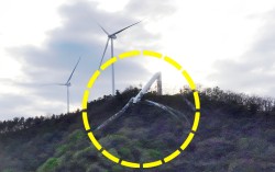 21일 오후 전남 화순군 도암면 우치리 화학산에 건설된 4.7㎿(메가와트)급 풍력발전기 타워가 쓰러져 있다. 연합뉴스 전남 화순군 야산에 설치된 대형 풍력발전기 타워(지지대)가 엿가락처럼 휘어버린 이례적인 사고가 발생했지만 사고 원인을 규명할 수 있을지는…