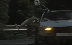경기남부경찰청 교통조사계는 드래그 레이싱, 드리프트 등 난폭운전 위험행위를 한 외국인 폭주단체 42명을 검거해 검찰에 송치했다고 22일 밝혔다. 사진은 조수석에 매달려 곡예를 부리는 피의자 모습. 사진 경기남부경찰청 심야 빈 도로에서 드래그 레이싱(단거리 가속 경…