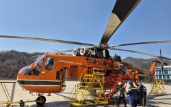 강원도 원주시 산림항공본부 에서 산불 진화용 헬기(S-64)의 세척 작업이 진행중이다. 박진호 기자 지난 1일 오전 강원도 원주시 산림청 산림항공본부 헬기계류장. 산불 진화작업을 마치고 돌아온 S-64 헬기의 세척작업이 한창이었다. ‘초대형 진화 헬기’로…