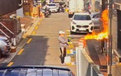 21일 서울 봉천동에서 60대 남성이 농약살포기로 추정되는 물건으로 불꽃을 발사하고 있다. [뉴스1] 21일 서울 관악구 봉천동 아파트 방화 용의자 A씨(61)가 지난해 층간 소음 문제로 다퉜던 위층집을 노리고 범행을 저지른 것으로 나타났다. A씨는 이 …