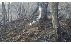 1일 경기도 화성시 마도면의 한 야산. 화마가 휩쓸고 간 자리에 남은 '뒷불'이 연기를 뿜어내고 있다. 사진 정은혜 기자 "아이쿠, 바람 조금 불자마자 또…" 지난 1일 오후 4시, 경기도 화성시 마도면의 한 야산. 산등성이에 오르자 산불감시요원 두 명이 갈…