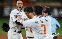 한화 이글스 선수들이 14일 롯데 자이언츠를 상대로 끝내기 밀어내기 볼넷을 골라내 승리를 거둔 직후 환호하고 있다. 사진 한화 이글스 프로야구 한화 이글스가 끝내기 밀어내기 승리를 거두며 4연승 행진을 이어갔다. 한화는 14일 대전 한화생명 볼파크…