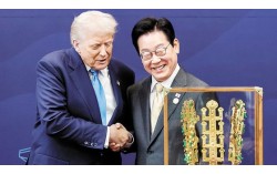 이재명 대통령이 지난해 10월 29일 경북 경주박물관에서 도널드 트럼프 미국 대통령에게 ‘천마총 금관 모형’을 선물한 뒤 악수하고 있다. 연합뉴스 미국이 한국에 대한 관세 인상을 통보하기 약 2주 전 “양국이 지난해 11월 체결한 조인트 팩트시트(공동 설명자료)의…
