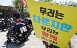 20일 오후 서울 종로구 마로니에 공원에서 장애인의 날을 맞아 열린 전국장애인차별철폐연대 전국집중결의대회에서 한 참가자가 전동휠체어에 피켓을 걸고 있다. 뉴스1 ‘장애인의 날’인 20일 전국장애인차별철폐연대(전장연)를 비롯한 장애인 단체들이 장애인 차별 철폐를 촉…