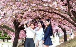 17일 오후 대구대학교 경산캠퍼스 공공인재대학 건물 뒤편 산책로에서 외국인 유학생들이 활짝 핀 겹벚꽃을 배경으로 사진을 찍고 있다. 뉴스1 겹벚꽃은 벚꽃이 지고 1~2주 정도 지나면 피는 꽃이다. 진분홍빛의 몽글몽글한 꽃송이가 특징인 겹벚꽃은 4월 중순이…