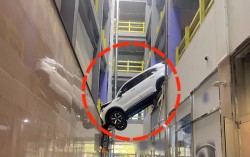 18일 오후 전남 순천시 오천동의 한 주차타워 2층에서 SUV 차량이 돌진하는 사고가 발생해 차량이 난간에 걸쳐져 있다. 사진 독자 제공, 연합뉴스 전남 순천시 한 주차타워 2층에서 스포츠유틸리티차량(SUV)이 난간 밖으로 돌진하는 사고가 발생했다. …