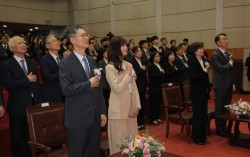 18일 오전 서울 종로구 재동 헌법재판소 대강당에서 열린 문형배·이미선 헌법재판관 퇴임식에서 참석자들이 국민의례를 하고 있다. 퇴임하는 문형배, 이미선 재판관은 각자 배우자와 함께 참석했다. 뉴스1 문형배(59‧사법연수원 18기) 헌법재판소장 권한대행이 “헌법재판…