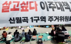 17일 서울 성북구청 앞에서 열린 미아리 성노동자 이주대책 마련 촉구 집회 참가자들이 현수막 아래에 앉아있다. 연합뉴스 서울 성북구 하월곡동에 위치한 사실상 시내 마지막 성매매 집결지인 ‘미아리 텍사스’에 대한 강제 철거에 반발한 성매매업소 주인과 종업원들이 17…