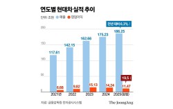 ‘피지컬 AI 맞수’ 두 풍경 현대자동차가 지난해 역대 최대 매출을 기록했으나 미국 관세 타격으로 수익성 지표는 ‘후진’했다. 김주원 기자 29일 현대차는 지난해 매출이 전년보다 6.3% 증가한 186조2545억원을 기록했다고 공시했다. 다만 영…