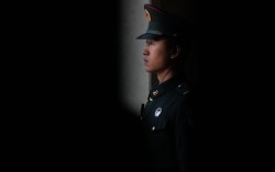 중국인민해방군 사병이 지난달 29일 국방부 월례 브리핑장에서 경비를 서고 있다. 중국인민해방군 기관지인 해방군보는 1월 31일과 2월 1일 이틀 연속으로 1면에 사설을 싣고 장유샤 중앙군사위 부주석과 류전리 중앙군사위 위원의 잔존 세력을 척결하겠다고 밝혔다. AP = …