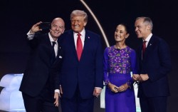 지난해 12월 5일 미국 워싱턴DC에서 열린 2026 북중미 월드컵 조추첨 행사에서 잔니 인판티노 국제축구연맹(FIFA) 회장, 도널드 트럼프 미국 대통령, 클라우디아 셰인바움 멕시코 대통령, 마크 카니 캐나다 총리(왼쪽부터)가 셀카를 찍고 있다. 로이터=연합뉴스 …