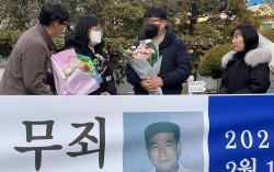 11일 광주지법 해남지원 앞에서 장모씨 유족이 무죄 선고 후 축하를 받고 있다. [연합뉴스] 보험금을 노리고 저수지에 차량을 빠뜨려 아내를 숨지게 한 혐의로 무기징역을 선고받은 남편이 재심에서 무죄를 선고받았다. 남편은 교도소 복역 중 법원의 재심 결정 …