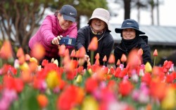 14일 대전 유성구 유림공원을 찾은 시민이 튤립을 보며 활짝 웃고 있다. 이 공원은 계룡건설 고(故) 이인구 명예회장이 2007년 대전시에 기증했다.