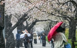 13일 서울 여의도 윤중로 벚꽃길에 눈이 내리고 있다. 4월 중순에 서울에 눈이 쌓인 것은 118년 전인 1907년 기상 관측 시작 이후 처음이다. 기상청은 15일까지 전국에 비바람과 함께 쌀쌀한 날씨가 이어질 것으로 예보했다.