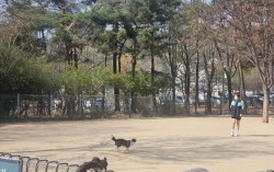 11일 낮 2시 월드컵공원반려견놀이터의 모습. 이날 놀이터에는 대형견과 소형견 10여 마리가 뛰어놀고 있었다. 신혜연 기자 11일 오후 2시 서울 마포구 월드컵경기장 한편에 있는 높은 철망 너머에서 골든래트리버와 진도믹스견 등 대형견 여러 마리가 흙바닥에서 뛰어놀…