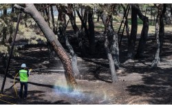 지난달 31일 경북 안동시 임하면 개호송 숲 일부가 산불에 피해를 본 가운데 수목치료업체에서 까맣게 탄 소나무를 세척하고 있다. 백운정 및 개호송 숲 일원은 국가지정문화재 명승 제26호다. 연합뉴스 경북 북부지역을 덮친 ‘괴물 산불’이 역대급 인명·재…