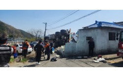 8일 낮 12시 40분쯤 경남 창원시 마산회원구 회성동 창원교도소 옆 회전교차로에서 주행 중이던 26t급 레미콘 차량이 연석에 부딪힌 뒤 주변에 있던 1t 화물차를 충돌하고, 인근 시멘트 블록으로 지어진 주택을 덮쳤다. 사진 독자 제공 한낮에 만취한 상태…