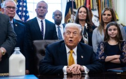 지난 14일(현지시간) 미국 워싱턴DC 백악관 집무실에서 도널드 트럼프 대통령이 '건강한 아이들을 위한 우유법'을 도입하는 내용의 행정명령을 설명하고 있다. 책상에 놓인 우유 주위로 낙농업자와 자녀들이 서 있다. EPA=연합뉴스 지난 14일(현지시간) 미…