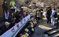 지난달 30일 북한산국립공원 관계자 및 산악안전지원단 소속회원들이 서울 은평구 북한산국립공원 등산로에서 산불 예방 캠페인을 벌이고 있다. 산악안전지원단 제공 최대 200만 원의 과태료에도 불구하고 국립공원 안에서 흡연하는 행위가 근절되지 않는 것으로 나타…