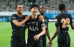 뉴캐슬전 선제골을 터뜨린 브레넌 존슨(왼쪽)과 어깨동무하고 기뻐하는 손흥민(가운데). 존슨은 토트넘 고별전을 치른 손흥민을 위해 그의 전매특허 ‘찰칵 세리머니’를 헌정했다. 우상조 기자 손흥민(33)이 6만4773명의 한국팬들 앞에서 주장 완장을 차고 토…