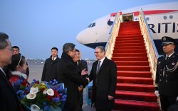 지난 28일 오후 중국 베이징 서우두 공항에 도착한 키어 스티머(오른쪽 두번째) 영국 총리가 영접 나온 란포안 중국 재정부장과 악수하고 있다. 8년만에 성사된 영국 총리의 중국 일정은 경제 현안에 촛점을 맞췄진 것으로 알려진다. 신화통신 29일 키어 스타…