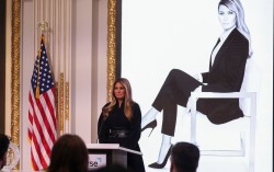 28일(현지시간) 미국 뉴욕 뉴욕증권거래소에서 멜라니아 트럼프 여사가 자신의 영화 홍보포스터를 배경으로 개장 종을 울리기에 앞서 발언하고 있다. EPA=연합뉴스 아마존이 도널드 트럼프 미국 대통령의 부인 멜라니아 트럼프 여사를 다룬 다큐멘터리 영화 ‘멜라…