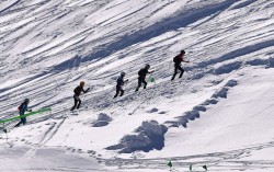 산악스키는 업힐과 장비 탈착, 다운힐의 3단계로 구성된다. 사진은 지난해 스위스 모르긴스에서 열린 월드컵 혼성계주 경기 업힐 단계에서 선수들이 경쟁하는 모습. [신화통신=연합뉴스] '산악스키(Ski Mountaineering, 스키모)'는 2026 밀라노·코르티나…