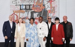 22일 열린 ‘장 미셸 바스키아: 과거와 미래를 잇는 상징적 기호들’ 특별전 기자간담회에 참석한 기획자 디터 부흐하르트, 안나 카리나 호프바우어, 바스키아의 여동생 제닌 에리보 내외, 컬렉터 래리 워시, 숨 프로젝트 이지윤 총괄감독, 데이비드 스타크 바스키아 재단 이사…