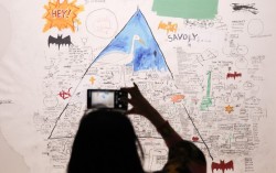 단어와 상징으로 가득한 바스키아의 대작 '무제’(1986)를 보는 관람객. 이 그림과 함께 총 153페이지의 창작 노트가 전시장 한 방을 가득 채웠다. 전시 섹션 이름은 ‘단어의 신전’, ‘장 미셀 바스키아 : 과거와 미래를 잇는 상징적 기호들’은 서울 동대문디자인플라…