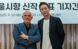 23일 서울 종로구 더프리마아트센터에서 열린 '2025 서울시향 신작 발표 기자간담회'애서 함께 포즈를 취한 얍 판 츠베덴 서울시향 음악감독(왼쪽)과 정재일 작곡가. 사진 서울시향 “음악 안에서 모든 걸 시작하고 끝내야 했어요. 그래서 지옥 같은, 절망 같은 날…