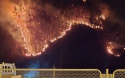8일 오후 7시56분쯤 경북 경주시 문무대왕면 안동교차로 인근에서 재발화한 산불이 강풍을 타고 산 정상 쪽으로 빠르게 확산하고 있다. [뉴시스] 지난 7일 경북 경주시 문무대왕면에서 발생한 산불이 강한 바람을 타고 확산되면서 소방당국이 8일 국가소방동원령…