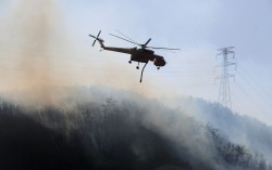 8일 오전 경북 경주시 문무대왕면 안동리 야산에서 산불 진화에 투입된 헬기가 진화작업을 벌이고 있다. 뉴스1 지난 7일 오후 경북 경주시 문무대왕면에서 발생한 산불이 강한 바람을 타고 확산하자 소방당국이 8일 오전 1차, 오후 2차 국가소방동원령을 발령했…