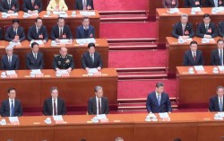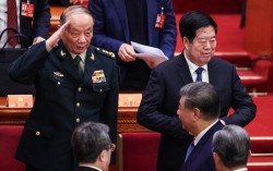 4일 중국 인민대회당에서 열린 전국정치협상회의 개막식이 끝나고 장성민 중앙군사위 부주석(왼쪽)이 시진핑 국가주석에게 거수경례를 하고 있다. 이날 정치국원 3명이 불참했다. [로이터=연합뉴스] 4일 중국의 연례 정치행사인 양회(兩會·전국인민대표대회와 전국정…