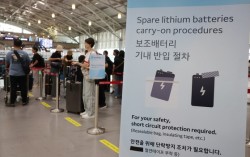 부산 강서구 김해국제공항 대한항공 수속카운터 앞에 보조배터리 기내 반입 절차 안내문이 세워져 있다. 연합뉴스 오는 26일부터 대한항공·아시아나항공·진에어·에어부산·에어서울 등 한진그룹 소속 5개 항공사가 기내 보조배터리 사용을 전면 금지한다. 지난해 1월…