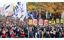 지난해 11월 8일 오후 서울 영등포구 여의대로에서 열린 2025 한국노총 전국노동자대회에서 노조 깃발이 입장하고 있다. 한국노총은 이 자리에서 정년 만 65세 연장 법제화와 주 4.5일제 시행 등을 촉구했다. 뉴스1 65세 정년연장(계속고용) 논의를 둘…